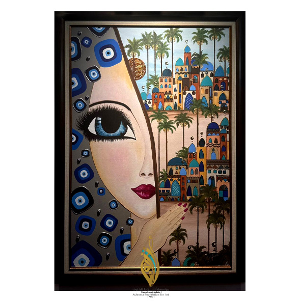 About the work: This painting embodies a visual vision that combines symbolism and identity, where the scene is divided into two overlapping worlds: a female face overflowing with tranquility and strength, contrasted with a vibrant oriental architectural space.